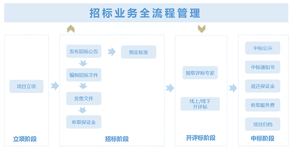 包含招標、投標、開標、評標、定標管理等,實現在線全流程管理操作