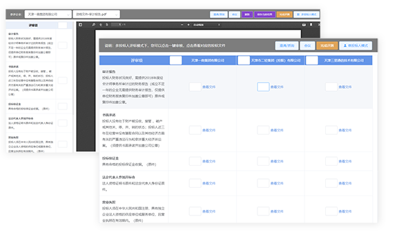 一次性多所有投標人進行評審,每個評審項分別對應響應文件,點擊即可定位查看相應文件。